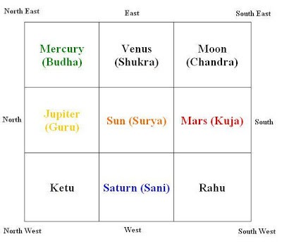 There will be separate Navagraha shrine or hall in Shiva temples.The Navagrahas in the Shiva temples are placed in a traditional manner on a single square like platform.The images of all nine planets are installed with Sun (Surya) in the center, Venus to the East, Saturn to the west, Jupiter to the North, Mars to the South, Mercury to North East, Moon to South East, Rahu to South West, Ketu to North West directions as follows: